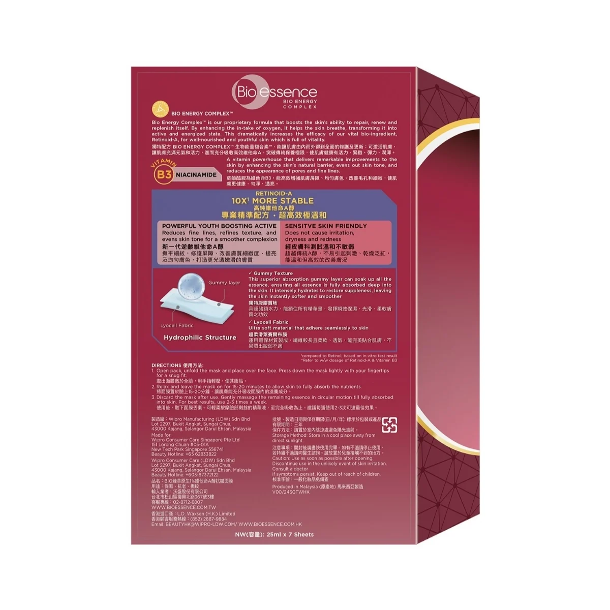 Vitamin B3 NIACINAMIDE A vitamin powerhouse that delivers remarkable improvements to the skin by enhancing the skin's natural barrier, evens out skin tone, and reduces the appearance of pores and fine lines. Retinoid-A 10x¹ More Effective Powerful Youth Boosting Active Reduces fine lines, refines texture, and evens skin tone for a smoother complexion Sensitve Skin Friendly Does not cause irritation, dryness and redness Gummy Texture This superior absorption gummy layer can soak up all the essence, ensuring all essence is fully absorbed deep into the skin. It intensely hydrates to restore suppleness, leaving the skin instantly softer and smoother Lyocell Fabric Ultra soft material that adhere seamlessly to skin ¹based on In-vitro test result