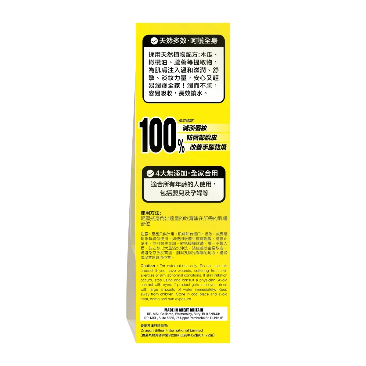 Natural ‧ Multi care for the whole body Natural plant formula with papaya, olive oil, aloe vera extracts. It moists, smooths fine lines, soothes allergies and immflammation. Therefore, safely and easily protect the whole family! Moist but not greasy, easy to be absorbed, and locks moisture in the skin for a long time. No 4 major additives ‧ Suitable for the whole family No fragrance, no preservatives, no mineral oil and no alcohol. Suitable for people of all ages, including babies and pregnant women.