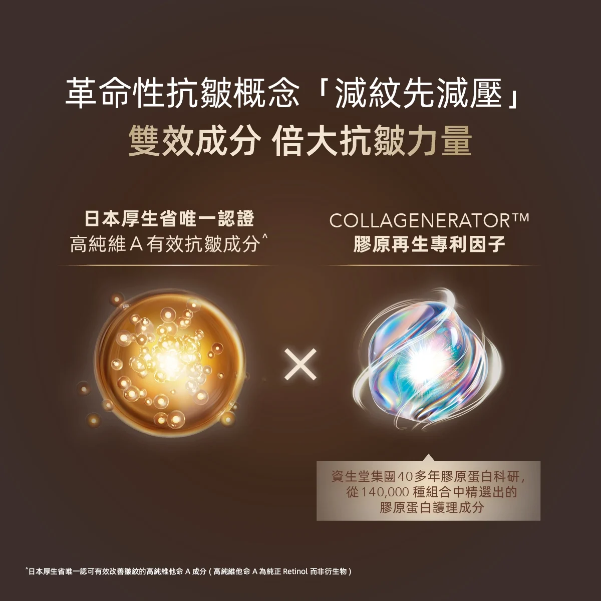 The innovative idea of "Relieve Stress Before Reducing Wrinkles" focuses on alleviating the pressure on the underlying collagen that results from dryness and hardening of the stratum corneum. Then, repair the cushion collagen in the dermis (including Type I, III, and V collagen) to restore the fullness of collagen and rebound collagen pressure, effectively combating 11 types of wrinkles. This is the only high-purity retinol ingredient in Japan approved by the Ministry of Health, Labour and Welfare# for effective wrinkle reduction. Within 8 hours, it stimulates natural hyaluronic acid production, instantly softening the skin and boosting hydration in the stratum corneum, thereby reducing ongoing pressure on the underlying collagen. Within 48 hours1, it activates Type III and Type V collagen, enhancing collagen density in the dermis and smoothing wrinkles from the stratum corneum. Powered by the COLLAGENERATOR™ Collagen Regeneration Complex, this exclusive formula nurtures strong collagen and effectively boosts Type I, Type III, and Type V Collagen found in the "AirBuffer Collagen Layer," while degrading and clearing away old, damaged collagen. The dual-action ingredients exponentially enhance anti-wrinkle power, rebounding collagen pressure and penetrating from the stratum corneum to the dermis to reduce wrinkles. Infused with En-ZY Lock Complex to protect the Collagen Stress-Relief Layer, it comprehensively protects the cushion collagen in the "collagen stress relief layer" (including Type I, III, and V collagen), inhibiting collagen breakdown and helps prevent wrinkle formation. In just 10 days³, crow's feet decreased by 18%, under-eye wrinkles by 31%, forehead wrinkles by 36%, nasolabial folds by 23%, and frown lines by 19%. Visibly smooths 11 types of wrinkles in 10 days⁴; after 4 weeks³, crow's feet reduced by 26%, under-eye wrinkles by 39%, forehead wrinkles by 45%, nasolabial folds by 30%, and frown lines by 29%. Within 2 weeks⁵, dark circles and eye bags showed significant improvement, with the skin becoming noticeably smoother and more refined. Exclusive Retinol TripleLock Technology™ ensures maximum purity and stability of high-purity retinol – 1.68× higher activity⁶ – by sealing it from oxygen and light. The oil-in-water encapsulation prevents oxygen contact, while production is carried out in an oxygen-controlled, wavelength-filtered environment to prevent oxidation. The airless vacuum tube packaging provides complete protection even during use. #The only high-purity Vitamin A ingredient approved by Japan's Ministry of Health, Labour and Welfare for effective wrinkle improvement (High-purity Vitamin A refers to pure retinol, not derivatives). *Cumulative shipments of Wrinkle Cream series: June 2017 – Apr 2025 (including limited editions) ¹ Test results based on in vitro, showing that high-purity vitamin A components promote the self-generation of Type I collagen ² Clinically tested on 33 Asian women aged 43-55 for 4 weeks. Forehead lines reduced by -45% vs. baseline. ³ Clinically tested on 33 Asian women aged 43-55 for 10 days and 4 weeks. ⁴ Clinically tested (visual assessment and instrumental assessments) on 33 Asian women aged 43-55 for 10 days. ⁵ Clinically tested (visual assessment and instrumental assessments) on 33 Asian women aged 43-55 for 2 weeks. ⁶ After 4 weeks, high-purity retinol in ELIXIR's airless tube retains 1.68× more activity vs. ordinary tube at each point is set as 1.