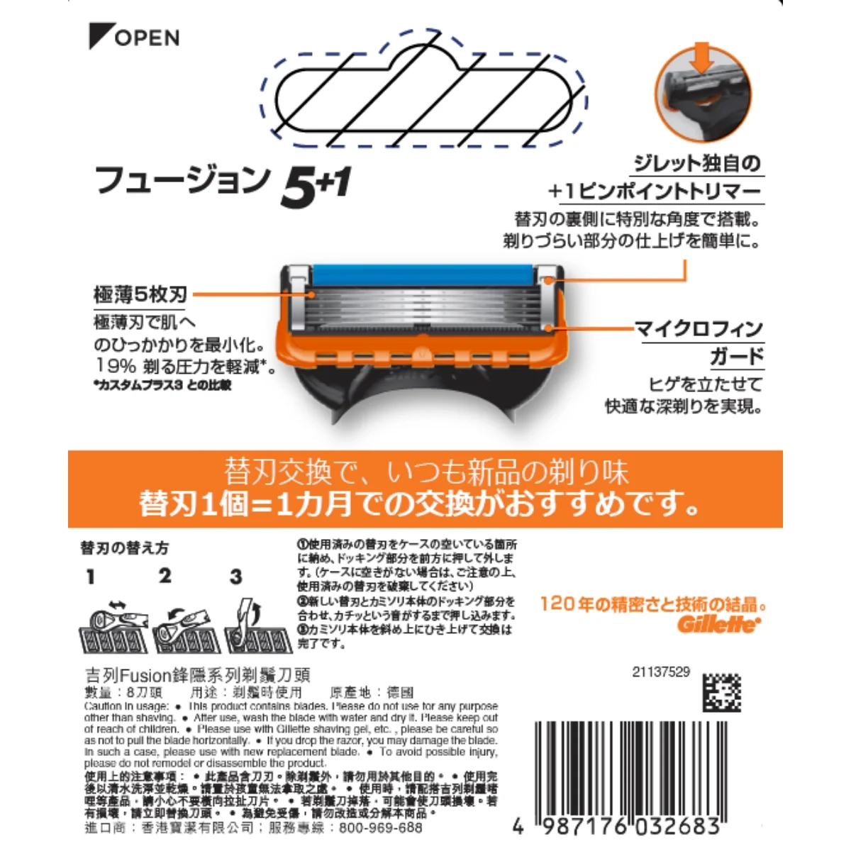 Gillette Fusion Razor have 5 precision blades spaced closer together (vs Mach3) for a smooth long lasting shave. Each razor blade refill equals up to one month of shaves.
