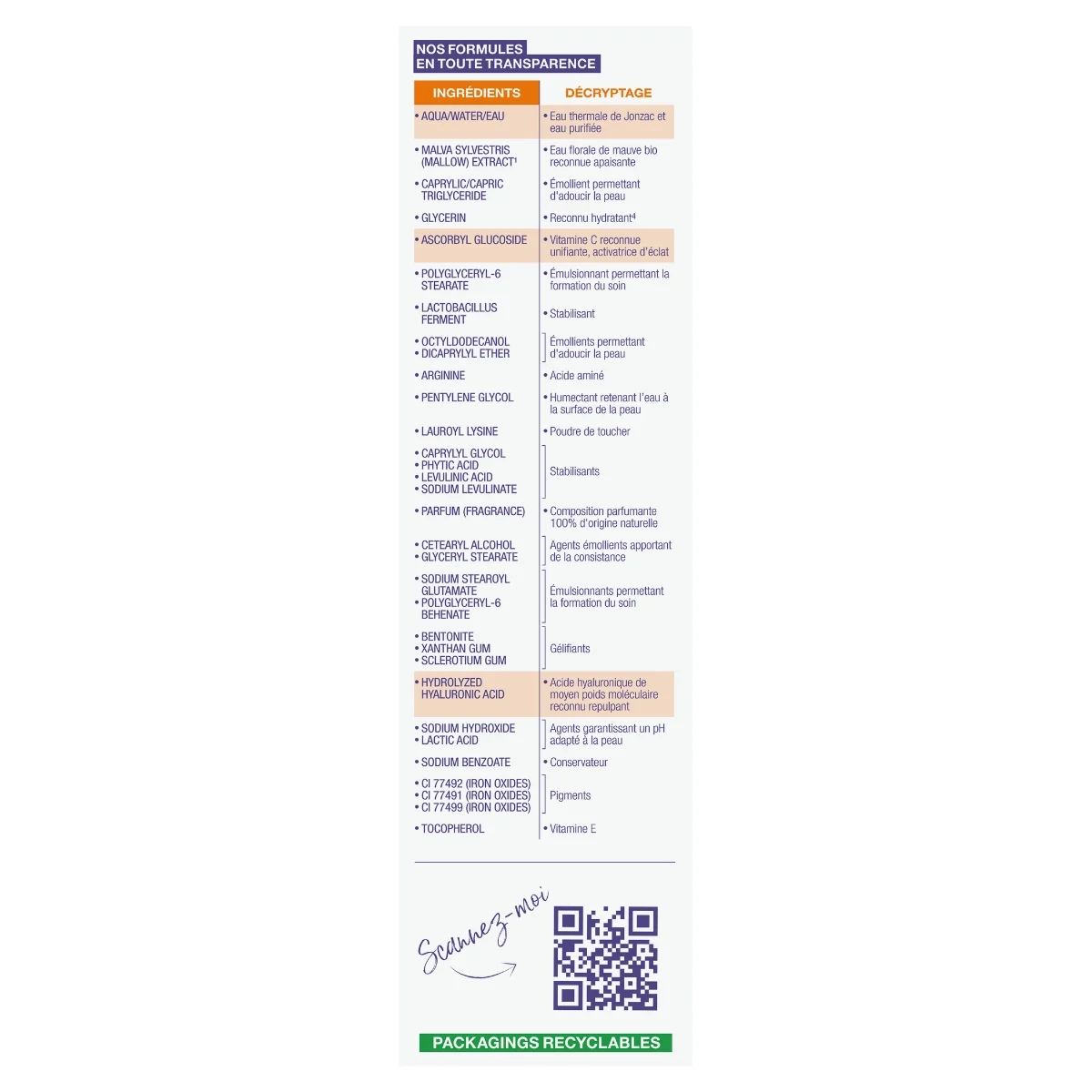 Aqua/Water/Eau, Malva Sylvestris (Mallow) Extract*, Jonzac Thermal Spring Aqua (Water), Caprylic/Capric Triglyceride, Glycerin, Ascorbyl Glucoside, Polyglyceryl-6 Stearate, Lactobacillus Ferment, Octyldodecanol, Dicaprylyl Ether, Arginine, Pentylene Glycol, Lauroyl Lysine, Caprylyl Glycol, Parfum (Fragrance), Cetearyl Alcohol, Glyceryl Stearate, Sodium Stearoyl Glutamate, Polyglyceryl-6 Behenate, Bentonite, Xanthan Gum, Sclerotium Gum, Hydrolyzed Hyaluronic Acid, Phytic Acid, Sodium Hydroxide, Sodium Benzoate, Lactic Acid, Levulinic Acid, Sodium Levulinate, CI 77492 (Iron Oxides), CI 77491 (Iron Oxides), Tocopherol, CI 77499 (Iron Oxides)