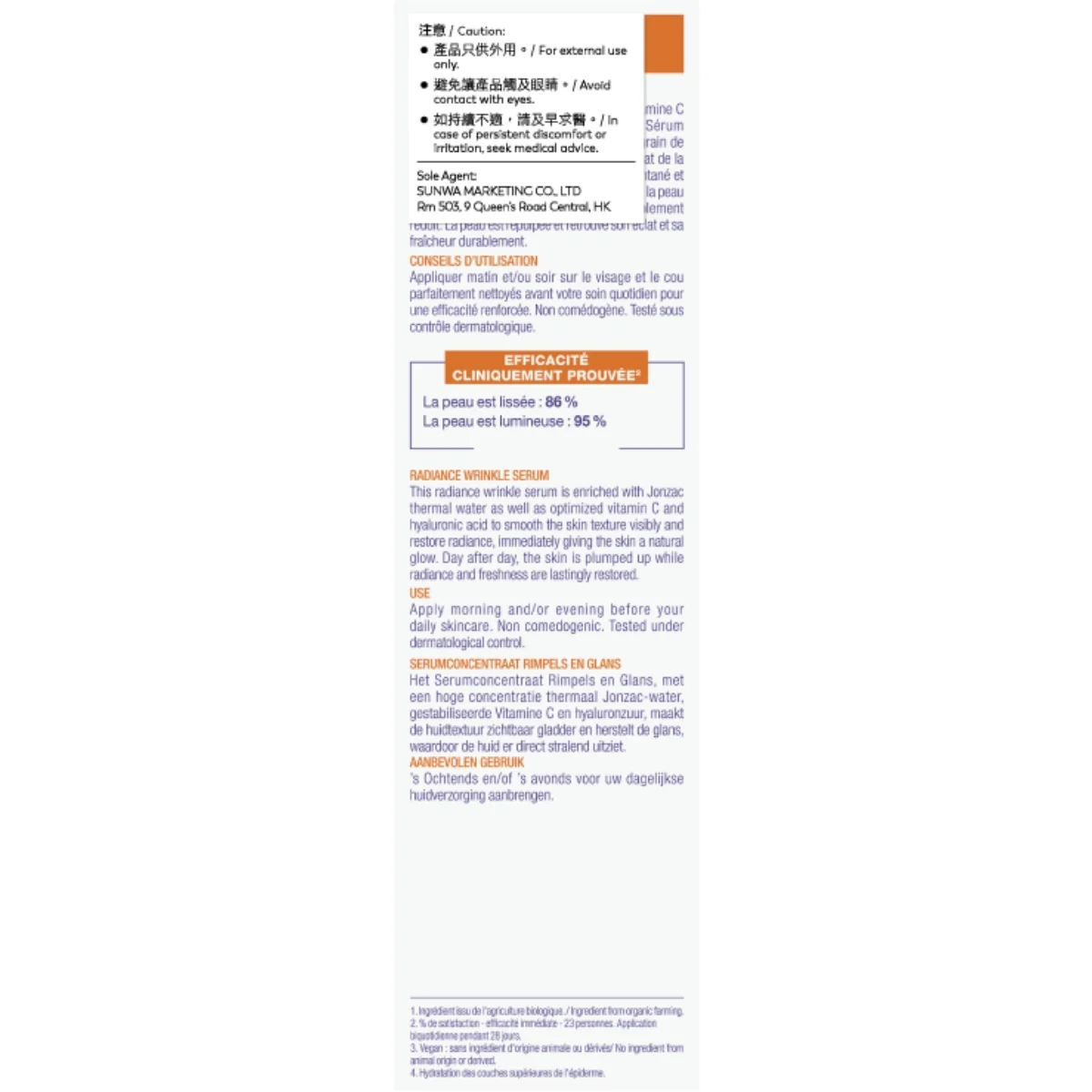 Apply the Wrinkle Radiance Serum morning and/or evening to the face or neck on perfectly clean skin and before your daily skincare, for added effectiveness. Caution: For external use only. Avoid contact with eyes. In case of persistent discomfort or irritation, seek medical advice.