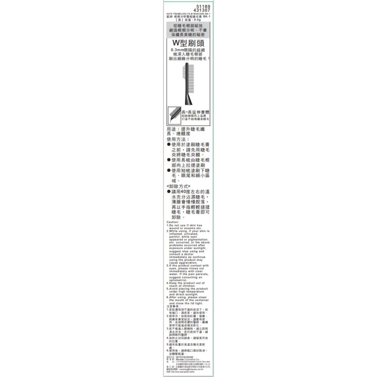 1. Curl the eyelashes with an eyelash curler first. 2. Pull the long comb along the root of the eyelashes towards the end. 3. Use a short brush to apply to the lower lashes, outer corners of eyes and finer areas. 1. Do not use if skin has wound or eczema etc. 2. While using, if your skin is inflamed, urticated, painful, white spot appeared or pigmentation, etc. occurred, or the above problems occurred after exposure under sunlight, suggest stop using and consult a doctor immediately as continue using the product may cause aggravation. 3. If the product contact with eyes, please rinses out immediately with clear water. If the pain persists, suggest consulting an optometrist. 4. Keep the product out of reach of children. 5. Avoid placing the product under high temperature and direct sunlight. 6. After using, please clean the mouth of the container and close the lid tight.