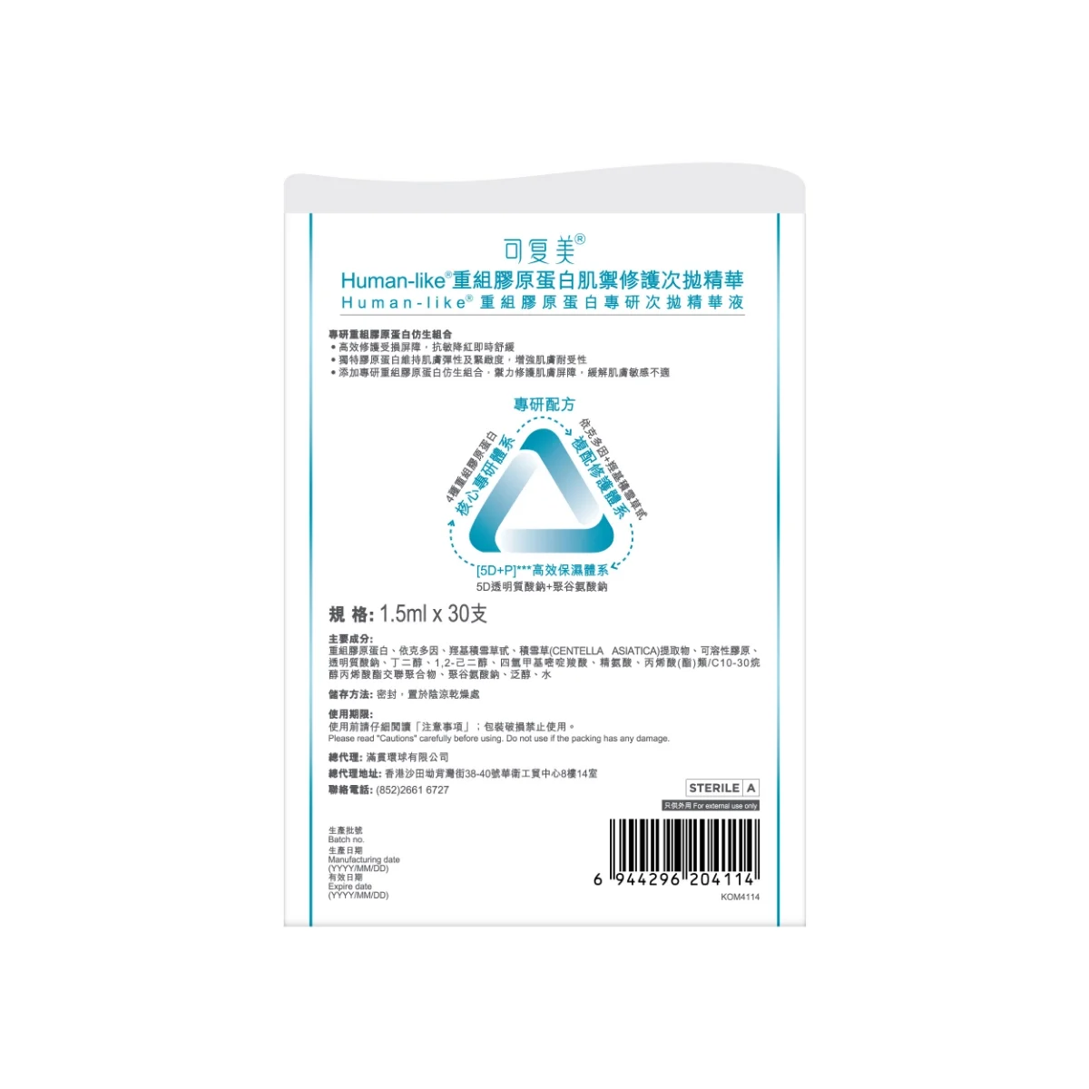 Recombinant Collagen, Ectoin, Hydroxy Centella Asiatica Glycoside, Centella Asiatica Extract, Soluble Collagen, Sodium Hyaluronate, Butylene Glycol, 1,2-Hexanediol, Tetrahydroxypropyl Ethylenediamine, Arginine, Acrylic Acid (Esters)/C10-30 Alkyl Acrylate Crosspolymer, Sodium Polyglutamate, Panthenol, Water.