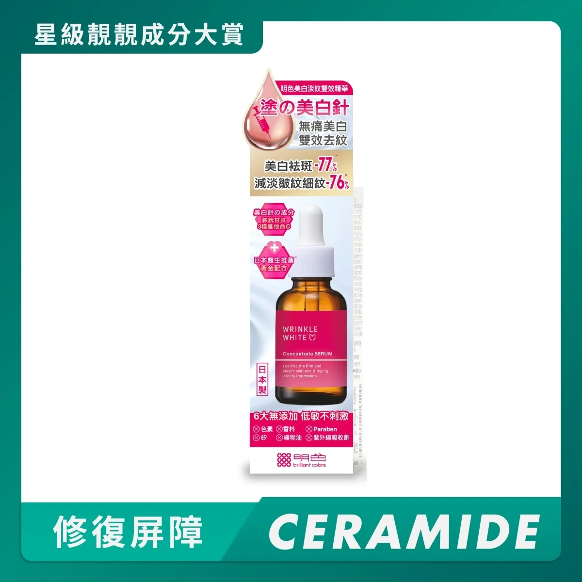 Powered by whitening injection ingredients – Glutathione and Triple Vitamin C Complex, Meishoku Wrinkle White Concentrated Serum features a Japanese dermatologist-recommended formula that whitens skin, fades dark spots, and reduces wrinkles and fine lines painlessly! Enriched with premium anti-aging and firming ingredients like Exosomes, Vitamin A, Collagen, and Peptides to restore youthful and plump skin. Infused with soothing ingredients such as Ceramides, Hyaluronic Acid, Dipotassium Glycyrrhizate, and Centella Asiatica Extract for skin-friendly care.