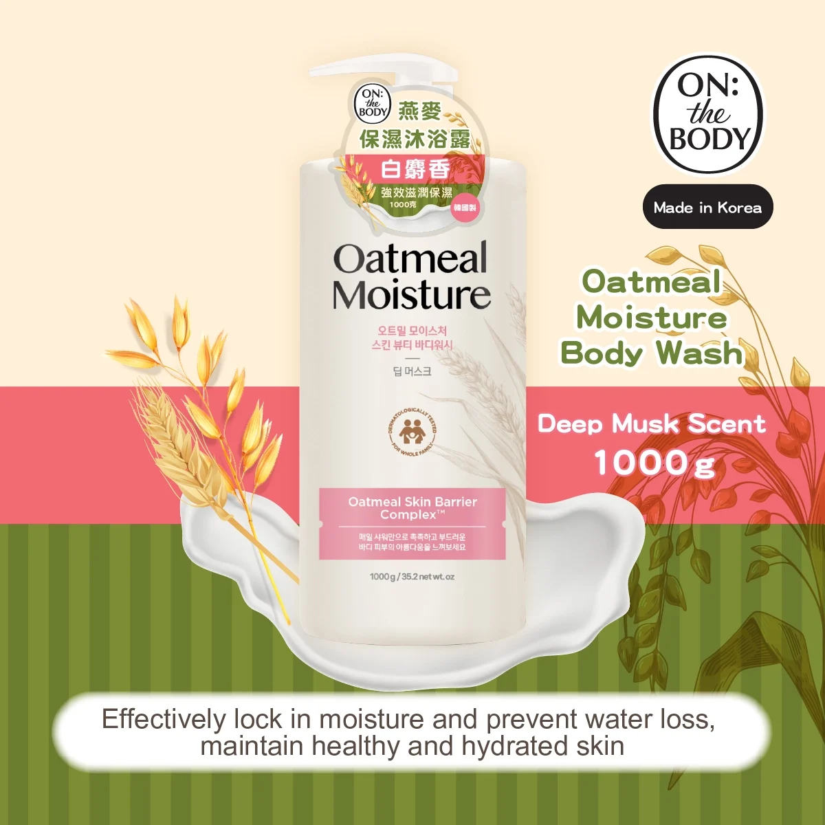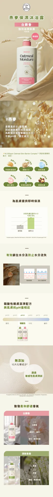 Oatmeal: Rich in β-glucan, forms a protective film on the skin's surface, locking in moisture for dry skin, balancing pH, and stabilizing skin condition. 40,000ppm Oatmeal Skin Barrier Complex™ Moisturizing Formula: Avena sativa (Oat) Kernel Oil: Soothes dry and sensitive skin Avena sativa (Oat) Kernel Extract: Locks in moisture 5 types of Hyaluronic Acid: Intense hydration Collagen: Boosts skin elasticity Ceramide: Repairs skin barrier Shea Butter: Nourishes the skin *Evaluation agency: Ellead Skin & Bio Research, 2024.09.09 – 2024.09.10, 20 people aged 32-59 #Tar pigments, Mineral oil, Silicone oil, Petrolatum, Talc, Ethylparaben, Butylparaben, Propylparaben, Methylparaben, Benzophenone-3