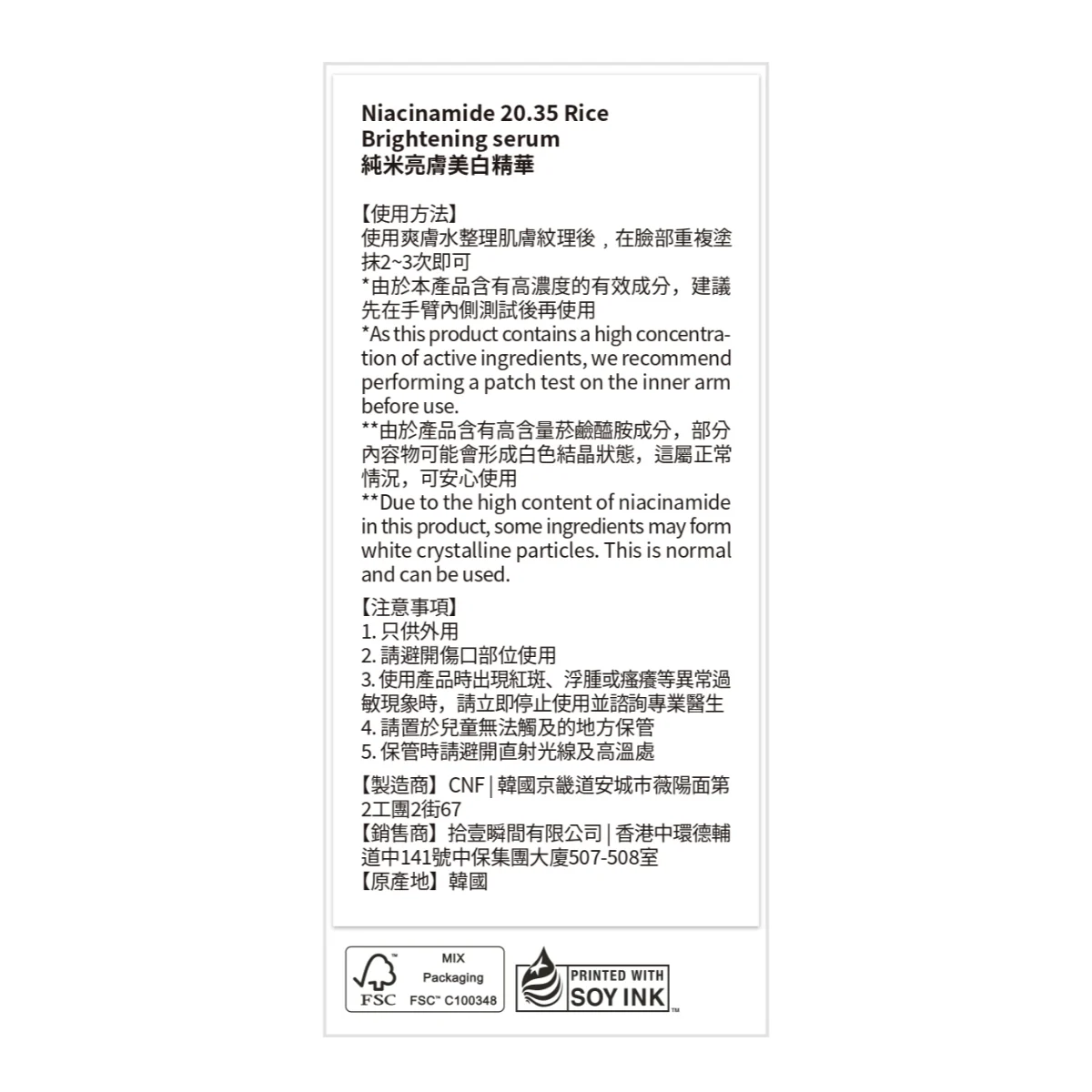 After applying toner to refine skin texture, reapply 2–3 times on the face as needed. *As this product contains a high concentration of active ingredients, we recommend performing a patch test on the inner arm before use. **Due to the high content of niacinamide in this product, some ingredients may form white crystalline particles. This is normal and can be safely used. Warnings: 1. For external use use only. 2. Do not use on damaged or irritated skin. 3. Stop use and ask a doctor if rash or irritation occurs. 4. Keep out of reach of children. 5. Keep away from direct sunlight.