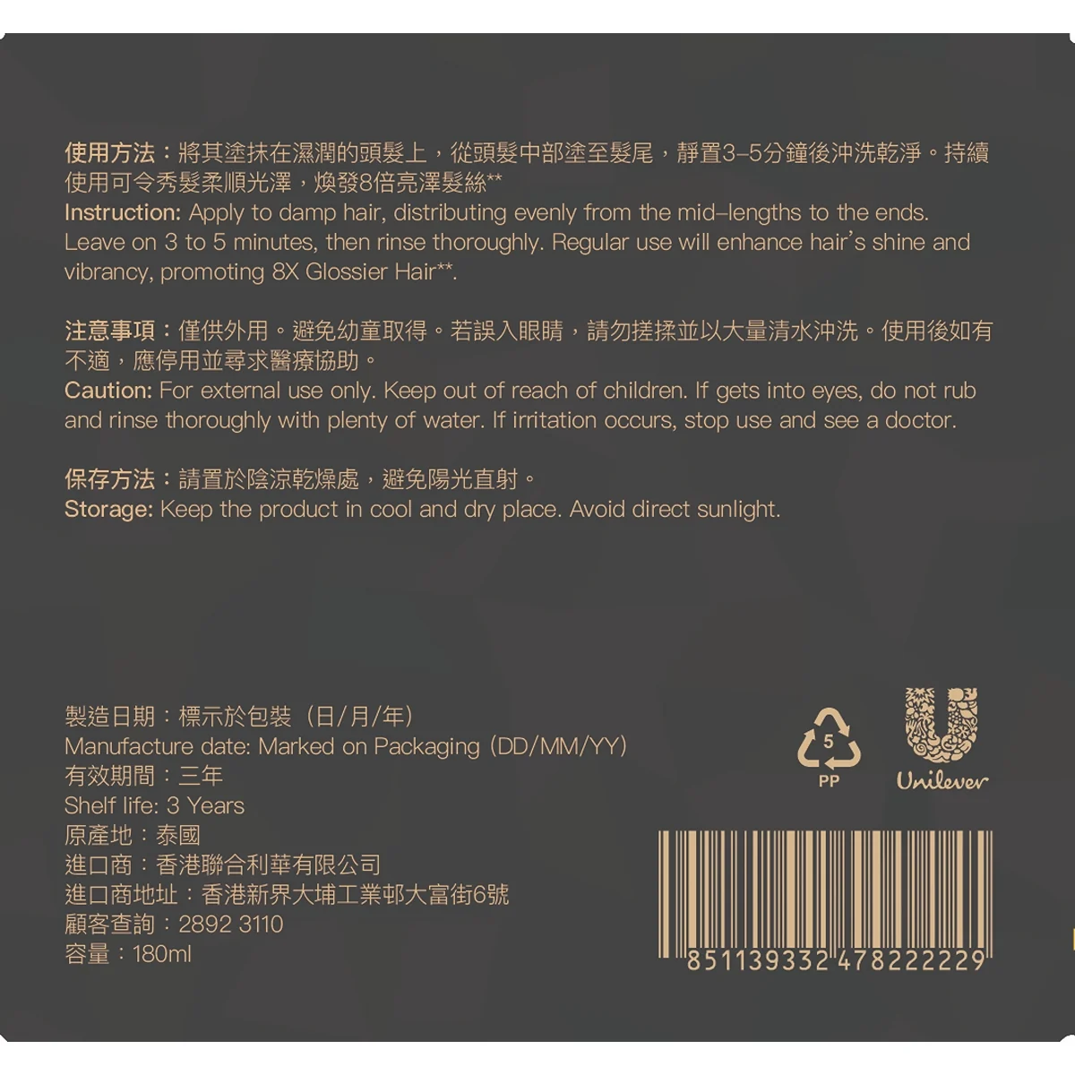 °3 Treatment Mask: Repairs Cuticles & Elevates Shine For best result, recommend to use full range of TRESemmé Lamellar GLOSS, mirror-like shine that lasts up to 24 hours' and to get 8X Glossy Hair** Suitable for all hair type. **Compared to shampoo without conditioning agents, hair treated with the full TRESemmé Black Gold Gloss Collection shows 8X shine improvement. (Unilever, 2024). ^Lamellar Gloss technology patented in the EU; applicable to conditioner and mask only. 'Compared to shampoo without conditioning agents, hair treated with the full system maintains higher shine after 24 hours (Unilever, 2024). Enriched with skincare-grade essence—trehalose, derived from natural plants. The formula forms a hydrating layer on the hair surface, maintaining moisture balance and preventing dryness. Deeply repair hair cuticles, reduces frizz and enhances hair shiness Penetrates deep into the hair fiber to restore dry strands, leaving hair smoother and glossier. Get 8X glossy hair** and mirror-like shine that lasts up to 24 hours' **Compared to shampoo without conditioning agents, hair treated with the full TRESemmé Lamellar Gloss range shows 8X improvement in shine (Unilever, 2024). 'Compared to shampoo without conditioning agents, hair treated with the full system maintains higher shine after 24 hours (Unilever, 2024).