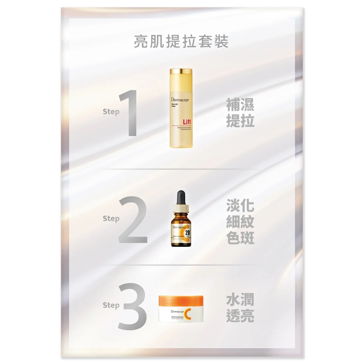 干细胞紧致化妆水: 超高渗透力深入角质层补水,采用纳米胶囊科技将高效成分输送至肌底;结合 Frame Lift Complex 和双重蛋白激活科技,刺激弹力纤维及胶原蛋白生成,有效提拉紧致、由内而外赋弹肌肤。 C20 纯维他命C精华: 蕴含 20% 纯维他命 C ,针对熟龄肌改善色斑、痘痕、毛孔、皱纹与松弛等肌肤问题;将抗氧化与抗衰老力量注入真皮层,有效淡斑减皱、紧致收毛孔,肌肤变得光滑亮白。 维他命C精华水漾乳霜: 采用双重维他命 C(纯 C + 速攻型 C)与「纳米纤维啫喱」技术提升 6 倍渗透力,并促进胶原增生 1.7 倍;集五大功效于一瓶,迅速改善缺乏弹性、肤色暗哑、色斑、干燥、粗糙等问题。