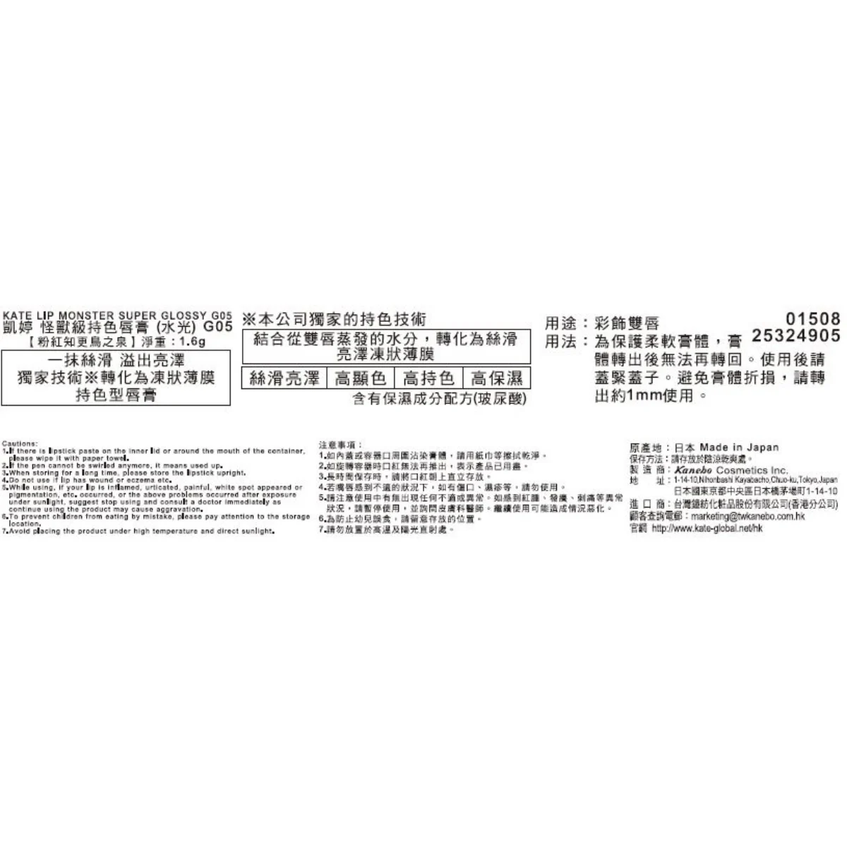 1. 如内盖或容器口周围沾染膏体,请用纸巾等擦拭干净。 2. 如旋转容器时口红无法再推出,表示产品已用尽。 3. 长时间保存时,请将口红朝上直立存放。 4. 若嘴唇感到不适的状况下,如有伤口、湿疹等,请勿使用。 5. 请注意使用中有无出现任何不适或异常。如感到红肿、发痒、刺痛等异常状况,请暂停使用,并询问皮肤科医师。继续使用可能造成情况恶化。 6. 为防止幼儿误食,请留意存放的位置。