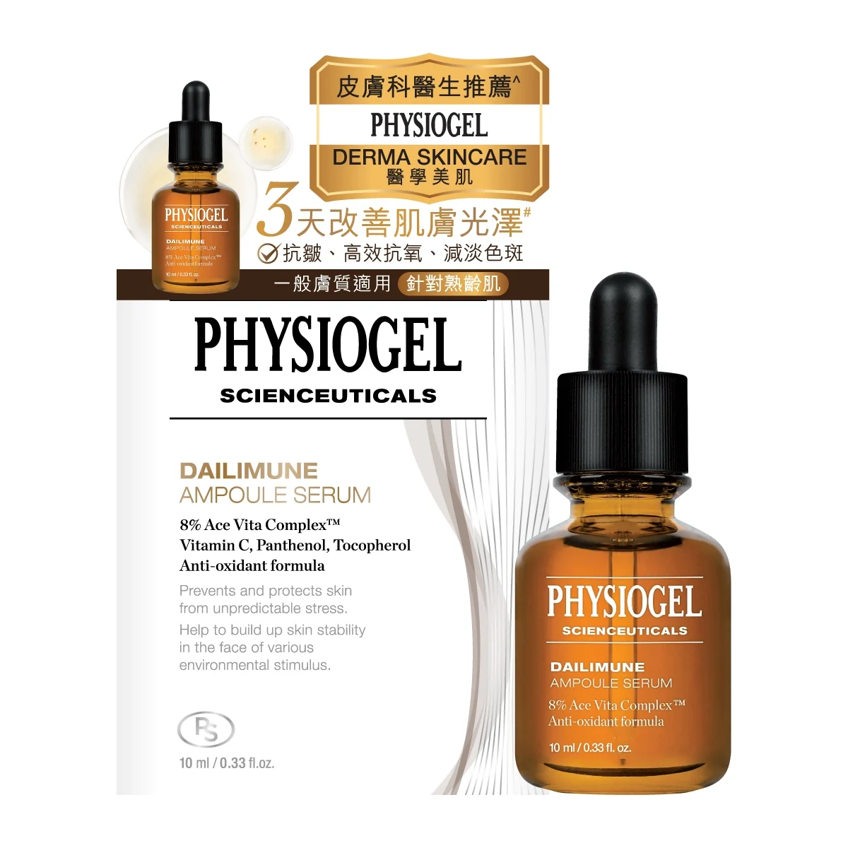 蕴含8% Ace Vita Complex™ 维他命复合物,成分为维他命C、E及维他命原B5, 有助提亮并改善暗沉肤色,令肌肤回复亮白感,淡化黑色素,减淡色班,同时高效抗氧,提升肌肤弹性,全面提升肌底锁水力。