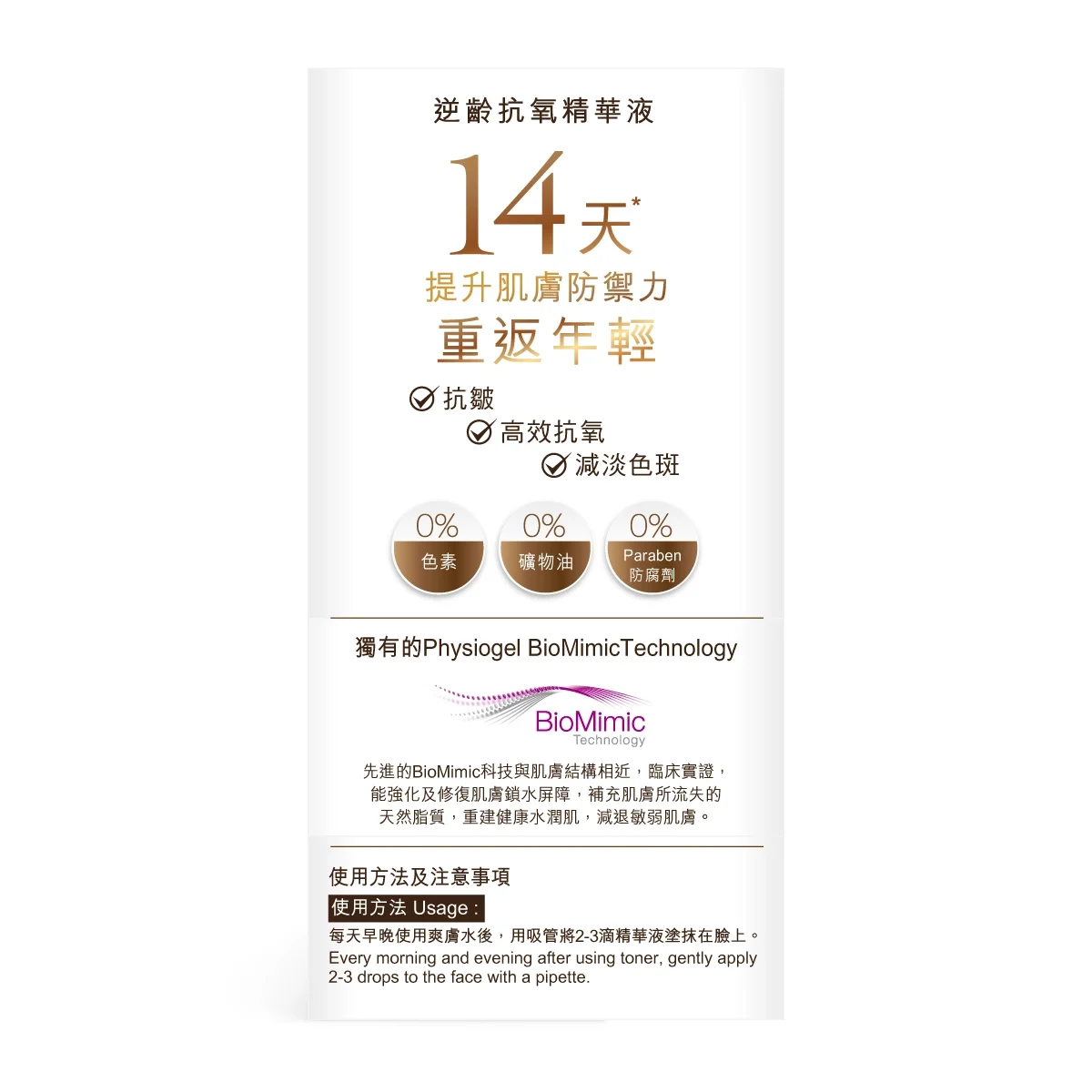 利用先进的BioMimic科技,研发出与肌肤结构及成分相近的精华液,能与肌肤自然融合,补充干燥肌肤所流失的天然脂质,临床实证能强化及修复肌肤天然锁水屏障,延缓肌肤老化,使肌肤弹润有光泽。