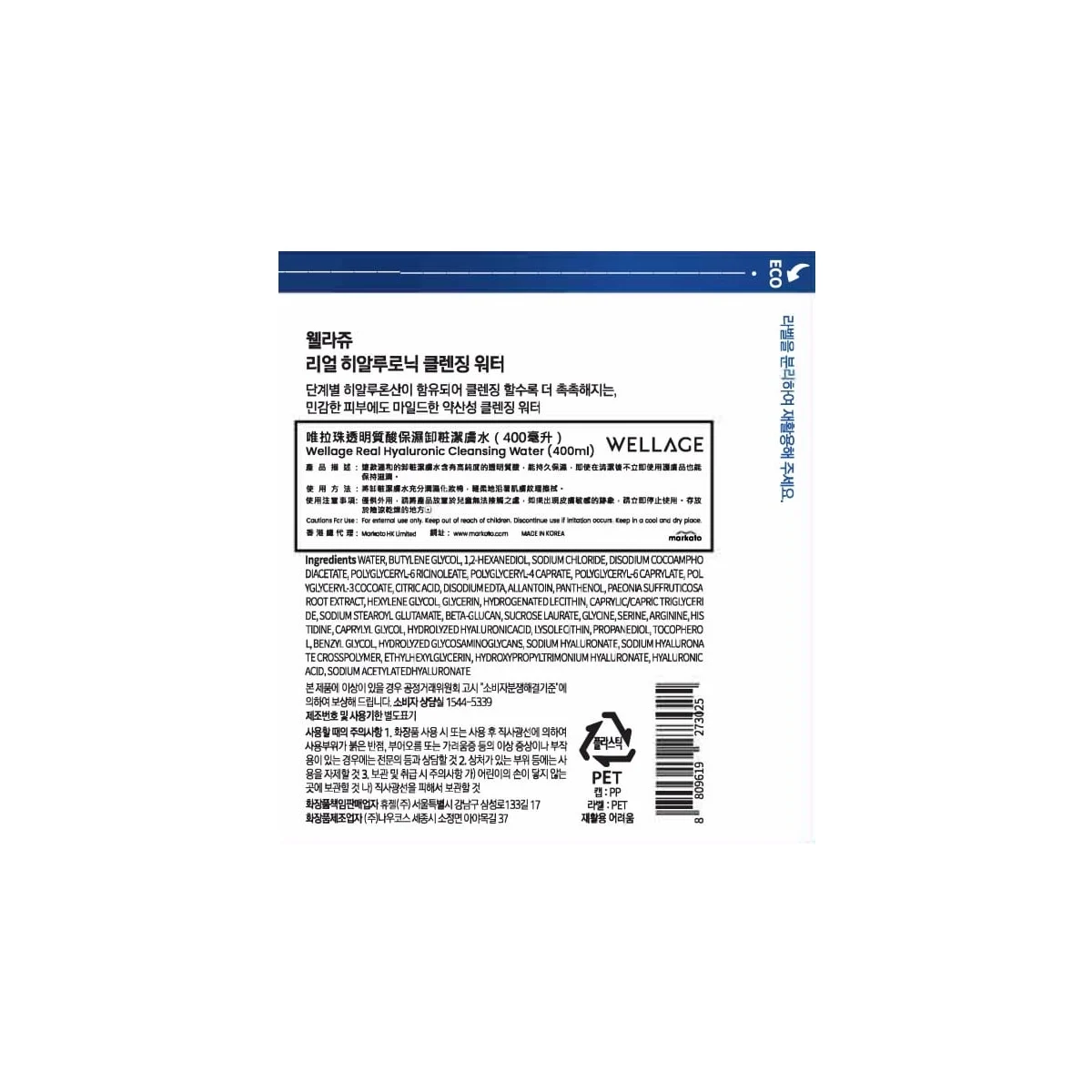 Wellage唯拉珠透明质酸保湿卸妆洁肤水 400毫升 Wellage唯拉珠透明质酸保湿卸妆洁肤水 400毫升