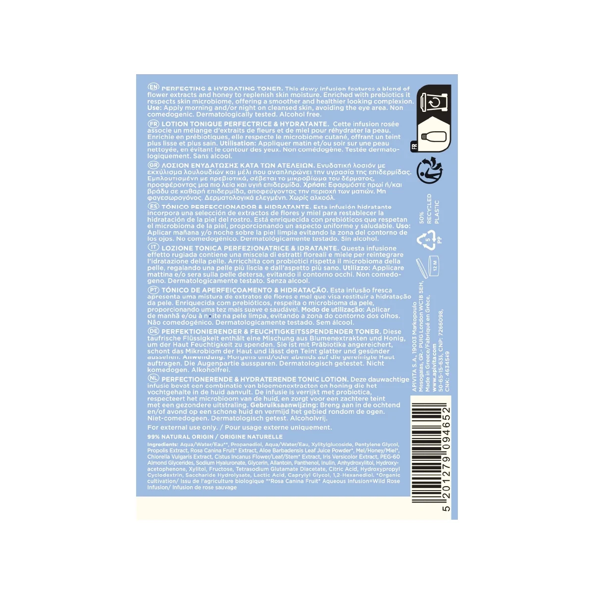 Aqua/Water/Eau**, Propanediol, Aqua/Water/Eau, Xylitylglucoside, Pentylene Glycol, Propolis Extract, Rosa Canina Fruit* Extract, Aloe Barbadensis Leaf Juice Powder*, Mel/Honey/Miel*, Chlorella Vulgaris Extract, Cistus Incanus Flower/Leaf/Stem* Extract, Iris Versicolor Extract, PEG-60 Almond Glycerides, Sodium Hyaluronate, Glycerin, Allantoin, Panthenol, Inulin, Anhydroxylitol, Hydroxyacetophenone, Xylitol, Fructose, Tetrasodium Glutamate Diacetate, Citric Acid, Hydroxypropyl Cyclodextrin, Saccharide Hydrolysate, Lactic Acid, Caprylyl Glycol, 1,2-Hexanediol. *Organic cultivation/ Issu de l'agriculture biologique **Rosa Canina Fruit* Aqueous Infusion=Wild Rose Infusion/ Infusion de rose sauvage