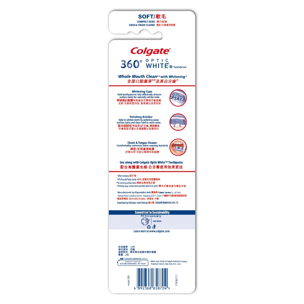 高露潔[3支優惠裝] 360光感白抛光美白牙齒牙刷 (軟毛) 全面口腔潔淨 : 牙齒、頰面、舌頭、牙齦