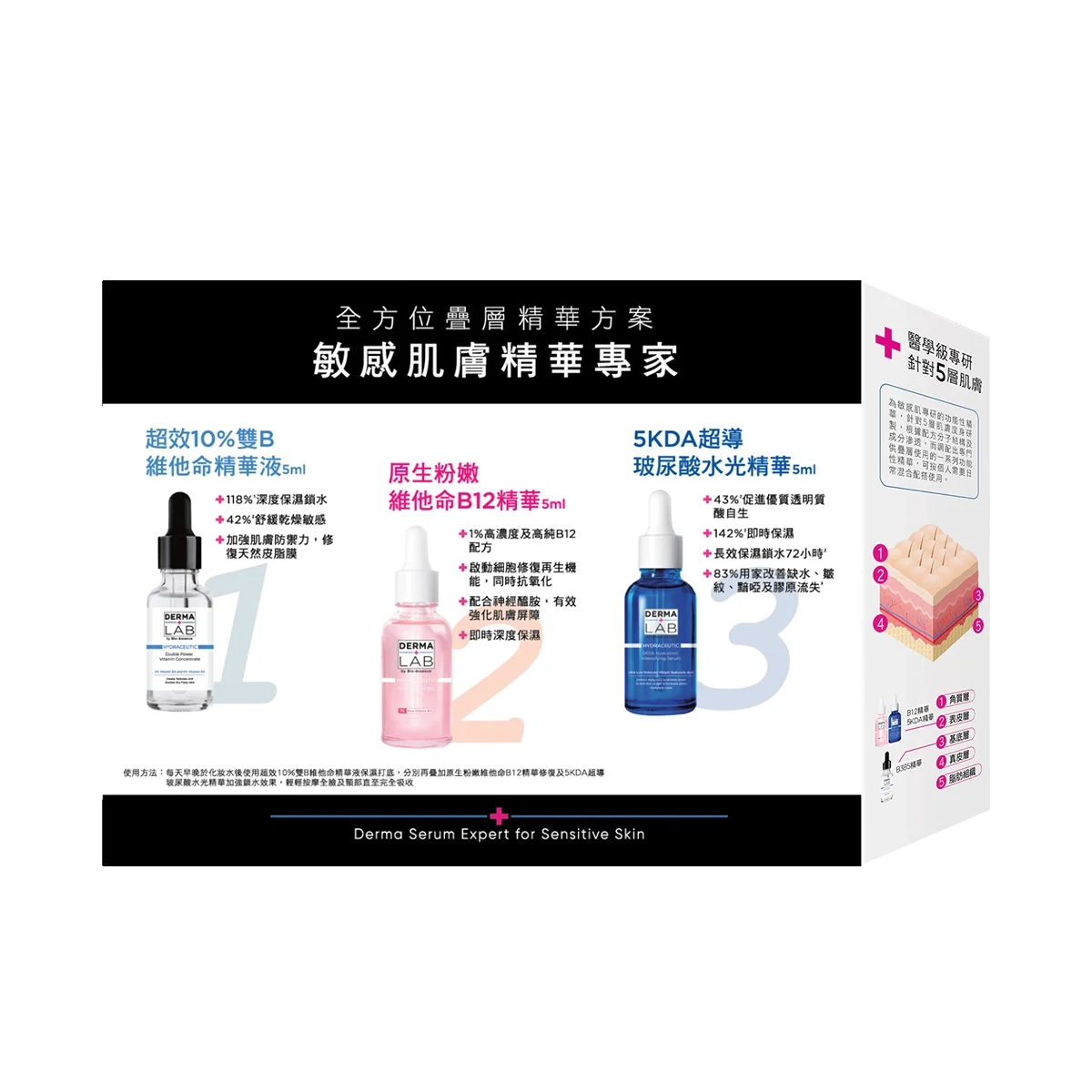 套裝包括: 超效10%雙B維他命精華液 + 原生粉嫩維他命B12精華 + 5KDA超導玻尿酸水光精華