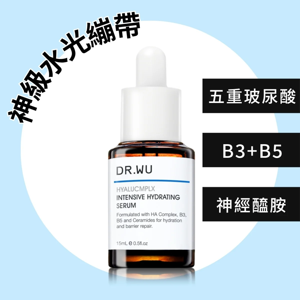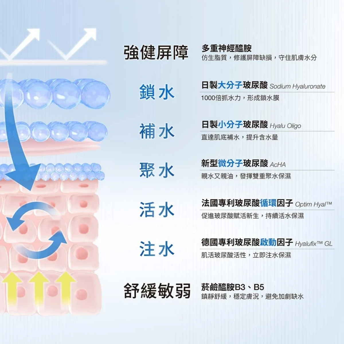新升級高濃度玻尿酸保濕配方:五重玻尿酸分子及因子、B3、B5、三重神經醯胺、活性酵母精華與海藻多醣精華。一瓶多效,極致保濕、舒緩敏感、修復角質、細胞再生,使肌膚更透亮水潤!由權威皮膚科醫生研發,適合一般及敏弱肌膚使用。