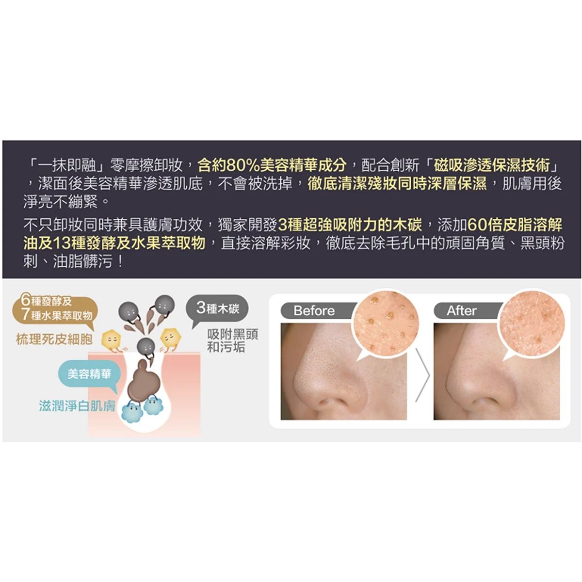「一抹即融」零摩擦卸妝,含80%美容精華成分,配合創新「磁吸滲透保濕技術」,潔面後美容精華滲透肌底,不會被洗掉,徹底清潔殘妝同時深層保濕,肌膚用後淨亮不繃緊。 不只卸妝同時兼具護膚功效,獨家開發3種超強吸附力的木碳,添加 60倍皮脂溶解油及13種發酵及水果萃取物,直接溶解彩妝,徹底去除毛孔中的頑固角質、黑頭粉刺、油脂髒污!