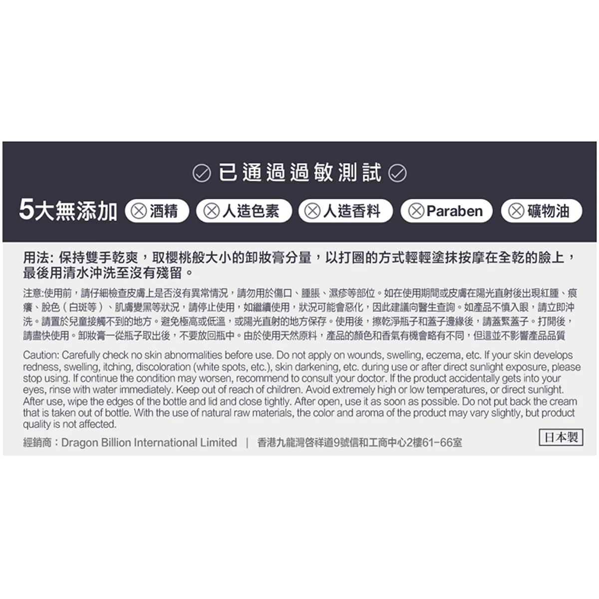 保持雙手乾爽,取櫻桃般大小的卸妝膏分量,以打圈的方式輕輕塗抹按摩在全乾的臉上,最後用清水沖洗至沒有殘留。 使用前,請仔細檢查皮膚上是否沒有異常情況,請勿用於傷口、腫脹、濕疹等部位。如產品不慎入眼,請立即沖洗。使用後,擦拭瓶子和蓋子的邊緣並蓋緊。