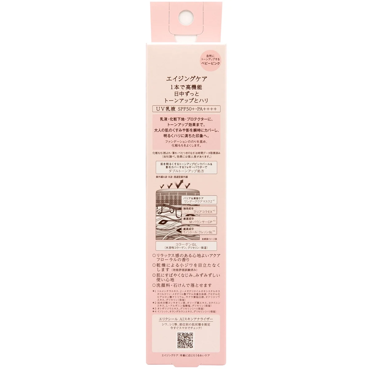 WATER (AQUA)・ALCOHOL・ETHYLHEXYL METHOXYCINNAMATE・ZINC OXIDE・PEG-8・BUTYLENE GLYCOL・OCTOCRYLENE・CAPRYLYL METHICONE・GLYCERIN・POLYBUTYLENE GLYCOL/PPG-9/1 COPOLYMER・POLYSILICONE-15・DIETHYLAMINO HYDROXYBENZOYL HEXYL BENZOATE・BIS-PEG-18 METHYL ETHER DIMETHYL SILANE・CETYL ETHYLHEXANOATE・BARIUM SULFATE・BIS-ETHYLHEXYLOXYPHENOL METHOXYPHENYL TRIAZINE・PEG/PPG-17/4 DIMETHYL ETHER・INOSITOL・PHYTOSTERYL MACADAMIATE・ROSMARINUS OFFICINALIS (ROSEMARY) LEAF OIL (ROSMARINUS OFFICINALIS LEAF OIL)・PRUNUS SPECIOSA LEAF EXTRACT・OLEA EUROPAEA (OLIVE) LEAF EXTRACT・LAMIUM ALBUM FLOWER/LEAF/STEM EXTRACT・CAMELLIA SINENSIS LEAF EXTRACT・SODIUM ACETYLATED HYALURONATE・POTENTILLA ERECTA ROOT EXTRACT・HYDROLYZED CONCHIOLIN PROTEIN・MELILOTUS OFFICINALIS EXTRACT・POLYQUATERNIUM-51・NASTURTIUM OFFICINALE LEAF/STEM EXTRACT・ARGININE HCl・COIX LACRYMA-JOBI MA-YUEN SEED EXTRACT・SOLUBLE COLLAGEN・TRIETHOXYCAPRYLYLSILANE・DIMETHYLACRYLAMIDE/SODIUM ACRYLOYLDIMETHYLTAURATE CROSSPOLYMER・HYDROXYPROPYL METHYLCELLULOSE STEAROXY ETHER・SORBITAN SESQUIISOSTEARATE・ALUMINUM HYDROXIDE・BHT・POLYSILICONE-2・SUCCINOGLYCAN・SILICA・MICA・HYPERICUM ERECTUM FLOWER/LEAF/STEM EXTRACT・DIMETHICONE・TOCOPHEROL・PHENOXYETHANOL・FRAGRANCE (PARFUM)・TITANIUM DIOXIDE (CI 77891)・IRON OXIDES (CI 77491)・IRON OXIDES (CI 77492)・