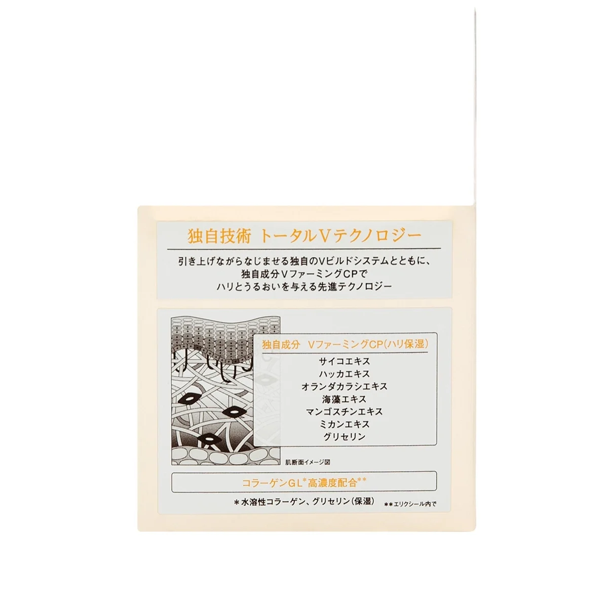 V Build 重塑肌底核心 對抗4大鬆弛根源 ELIXIR 研究團隊透過4D技術,精準分析皮膚動態,發現弱化的肌底核心會導致鬆弛問題,致力研發獨家反引力V緊膚科⁠技“Total V Technology”*,針對面部皮膚老化下垂的4大成因,糅合V Build CP緊緻輪廓複合物,注入多種天然植萃精華,搭配重塑V面按摩手法,激活幹細胞、肌底深層肌肉,鞏固肌膚的核心框架,瞬間提升V輪廓,肌膚回復緊緻飽滿 蘊含有機迷迭香萃取精華,活化真皮幹細胞,修復真皮層肌底結構,減少膠原流失 鳶尾根萃取精華煥活昏睡的真皮幹細胞,抑制纖維母細胞老化 甘草及覆盆子萃取精華激活於毛囊深層的立毛肌,撐起皮膚網絡結構,抵禦地心引力,改善鬆弛 抗氧地榆萃取精華激活肌肉細胞,提升面部表情肌肉,收緊提拉、提升面部輪廓 V Firm 針對5大膠原蛋白 緊緻回彈 富含V Firming CP膠原緊緻複合物,糅合6種天然植萃精華,為資生堂集團旗下首次同時賦活5種膠原蛋白的成分,全面針對I、III、IV、V、VII型膠原蛋白,全方位促進膠原蛋白增生、支撐及強韌真皮層,提升面部立體輪廓,結合M-Bouncer Complex 膠原循環再生精華,促進膠原自生循環,呈現飽滿富彈性的年輕肌膚狀態 V Keep 滋潤貼服 獨有V Keep 成分,一抹瞬間成薄膜,質感豐盈柔滑,築成緊緻彈性的保護屏障;膠原蛋白GL成分,深入滲透角質層,24小時持久保濕鎖水,讓肌膚散發水潤光澤