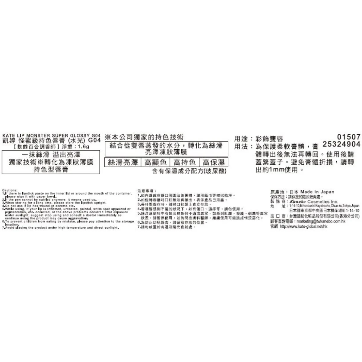 1. 如內蓋或容器口周圍沾染膏體,請用紙巾等擦拭乾淨。 2. 如旋轉容器時口紅無法再推出,表示產品已用盡。 3. 長時間保存時,請將口紅朝上直立存放。 4. 若嘴唇感到不適的狀況下,如有傷口、濕疹等,請勿使用。 5. 請注意使用中有無出現任何不適或異常。如感到紅腫、發癢、刺痛等異常狀況,請暫停使用,並詢問皮膚科醫師。繼續使用可能造成情況惡化。 6. 為防止幼兒誤食,請留意存放的位置。