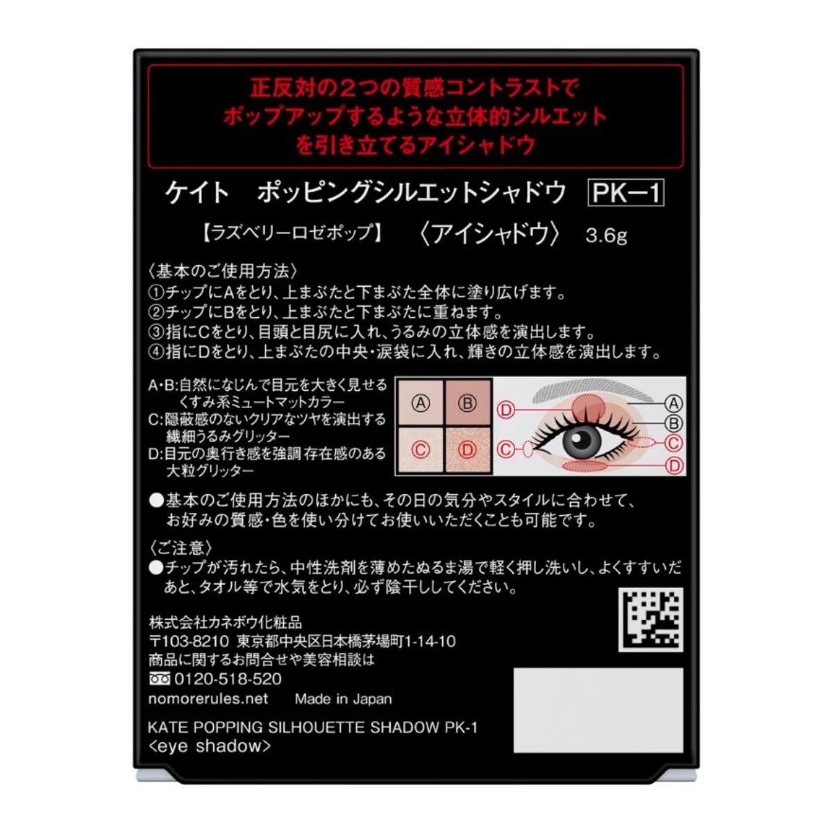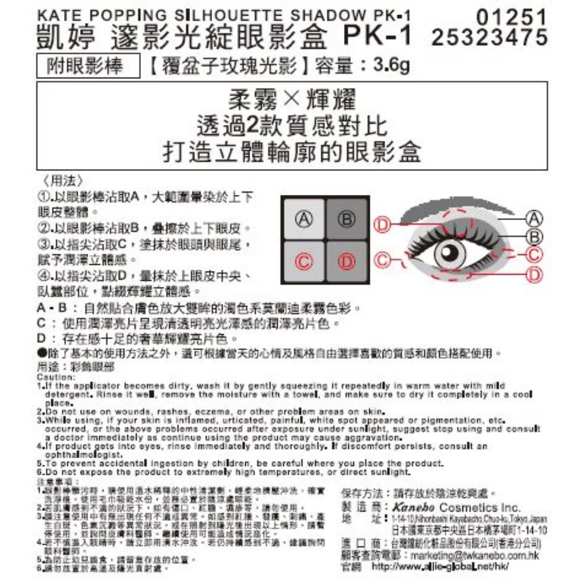 1. 以眼影棒沾取A,大範圍暈染於上下眼皮整體。 2. 以眼影棒沾取B,疊擦於上下眼皮。 3. 以指尖沾取C,塗抹於眼頭與眼尾,賦予潤澤立體感。 4. 以指尖沾取D,暈抹於上眼皮中央、臥蠶部位,點綴輝耀立體感。