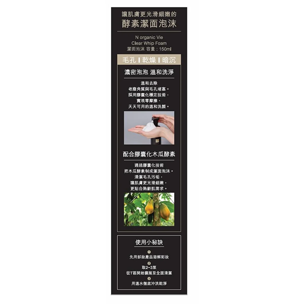 Vie 透亮酵素泡沫潔面乳以木瓜酵素配合豐盈泡沫,帶走污垢與暗啞角質,同時保持肌膚舒適不繃緊。輕盈綿密的泡沫容易推開,幾乎無需用力搓揉,特別適合乾燥或熟齡肌追求細緻光澤膚感。