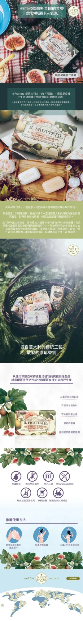 以無花果混合杏仁牛奶,散發出迷人的香味,同時修復和潤澤肌膚,中和肌膚酸度,以古老果園內迷人香味為靈感。