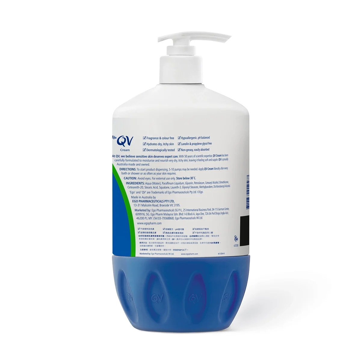 高度保濕的豐盈乳霜,預防及舒緩非常乾燥痕癢肌膚。QV潤膚膏科研配方,蘊含多種保濕成分,專為乾燥敏感皮膚研製。質地豐盈,更蘊含天然皮脂成分角鯊烯 (Squalene)提取的角鯊烷(Squalane)。為達到最佳效果,建議於沐浴後使用。